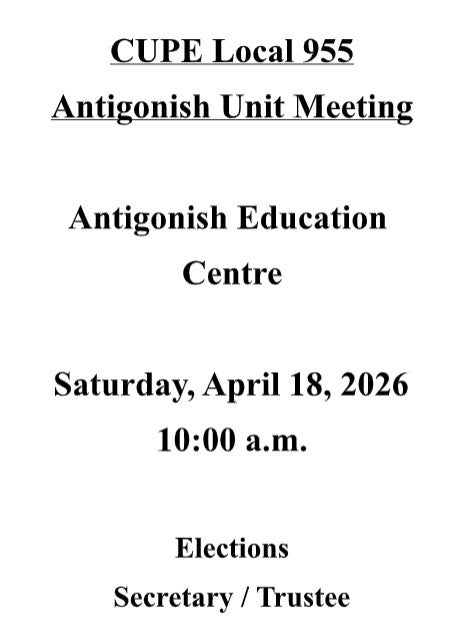 Antigonish Unit Meeting Posted on April 10, 2026 by CUPE 955 Share this: Click to share on Facebook (Opens in new window) Facebook Click to share on X (Opens in new window) X